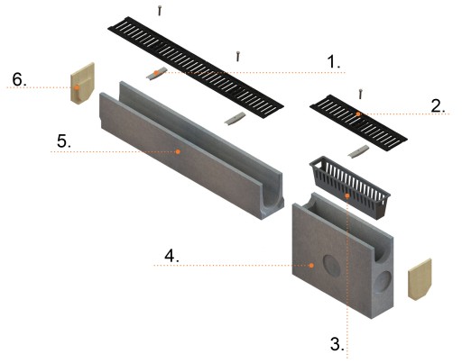 Korytka (kanały) betonowe z wzmocniem z blachy ocynkowej (okuciem) i rusztem żeliwnym do wykonywania odpływów wody (odwodnień) dróg publicznych, wewnęrznych, parkingów, ogrodów, garaży, na przydomowych podjazdach i wszystkich innych miejscach gdzie występuję ciężki ruch kołowy. Tradycyjna betonowa wytrzymała konstrukcja zapewnia trawłość, bezproblemowy montaż i eksploatację, a okucie z blachy wzmacnia krawędź i zabezpiecza przed wykruszeniem.