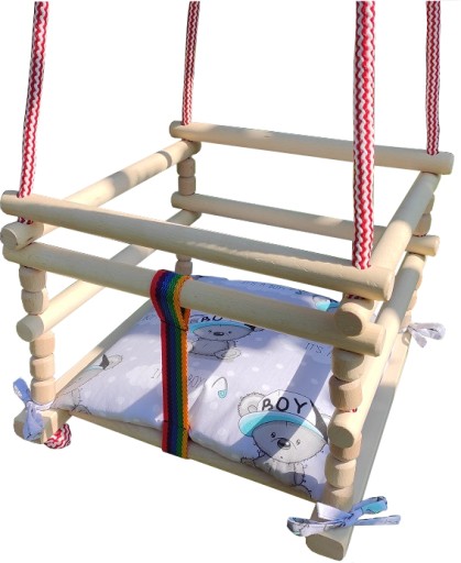 Huśtawka wykonana jest solidnie i starannie z drewna bukowego, posiada kolorową poduszkę.