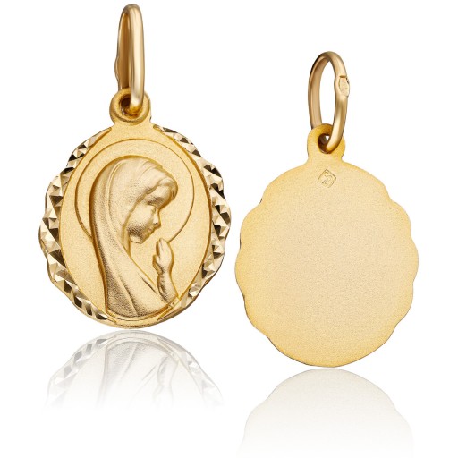 Medalik z wizerunkiem Matki Boskiej ze złożonymi do modlitwy rękami.