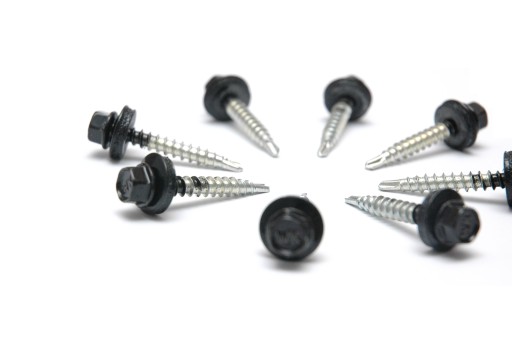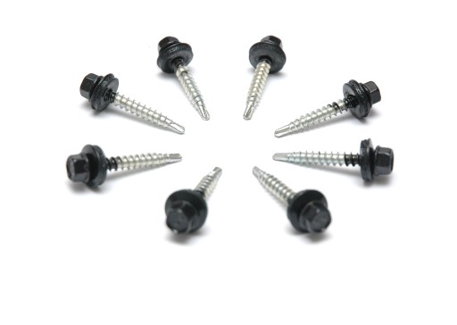 Wkręty samowiercące ze stali niskowęglowej z podkładką gumową typu EPDM przeznaczone do mocowania blach, blachodachówki, i obróbek blacharskich do podłoży drewnianych.