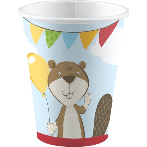 - Kubeczki papierowe z lisem i bobrem trzymającymi balonik