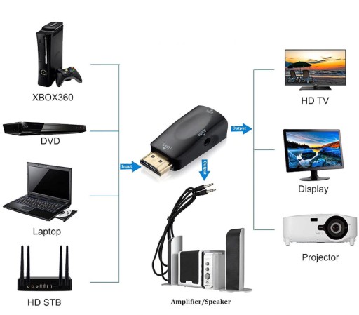 - Urządzenie konwertuje cyfrowy sygnał HDMI do sygnału analogowego VGA (nigdy odwrotnie). Dodatkowo konwertuje dźwięk cyfrowy HDMI do analogowego dźwięku stereo.