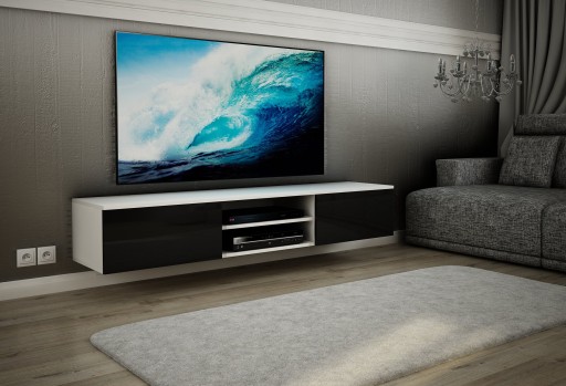 - fronty w połysku, po środku półka na sprzęt RTV, dwie przestronne komory otwierane dotykowo TIP-ON (bez uchwytu) o szerokości 70 cm, płyta tylna szafki wykonana z HDF.