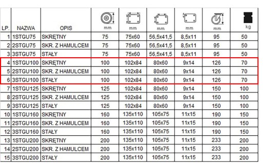 Zestaw składa się z czterech kółek wyposażonych w mocowanie na płytkę. W skład zestawu wchodzą dwa zestawy stałe o kodzie 3STGU100 (poz.6 w tabeli), jedno koło skrętne z hamulcem o kodzie 2STGU100 (poz. 5 w tabeli) oraz jedno koło skrętne o kodzie 1STGU100 (poz. 4 w tabeli).