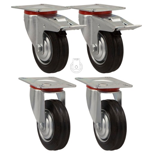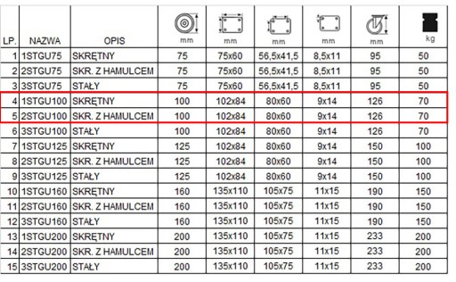 Zestaw składa się z czterech kółek wyposażonych w mocowanie na płytkę. W skład zestawu wchodzą dwa zestawy skrętne o kodzie 1STGU100 (poz.4 w tabeli) oraz dwa koła skrętne z hamulcem o kodzie 2STGU100 (poz. 5 w tabeli).