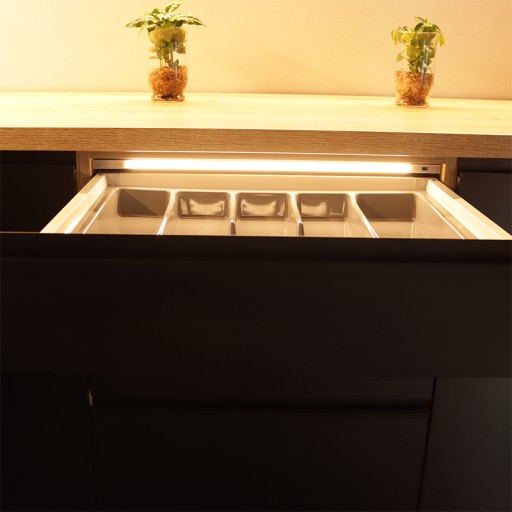 Listwa została wyposażona w nowoczesne i bardzo wydajne diody LED 2835 klasy Premium, które zapewniają idealne oświetlenie szuflad zarówno płytkich, jak i głębokich przy pełnym wysuwie.