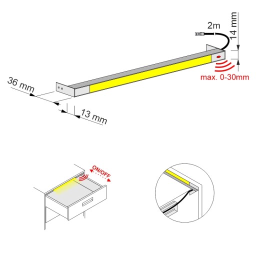 Dzięki wbudowanemu wyłącznikowi zbliżeniowemu oświetlenie LED włączy się natychmiast po otwarciu szuflady i wyłączy zaraz po jej zamknięciu przez co nie marnuje energii.