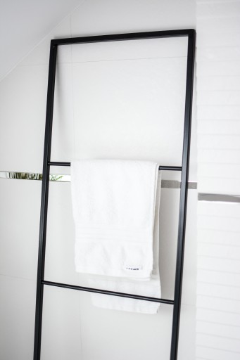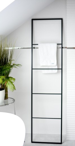 Metalowa drabinka/wieszak w stylu loftowym/industrialnym. Wykonana z metalu malowanego proszkowo, dzięki czemu jest trwała i odporna na wilgoć w przeciwieństwie do drewnianych drabinek. W zestawie podkładki antypoślizgowe, zapobiegające przesuwaniu.