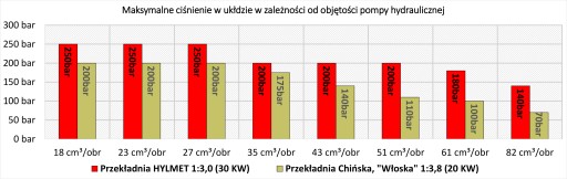 Parametry zestawów przekładni w zależności od pompy hydraulicznej: