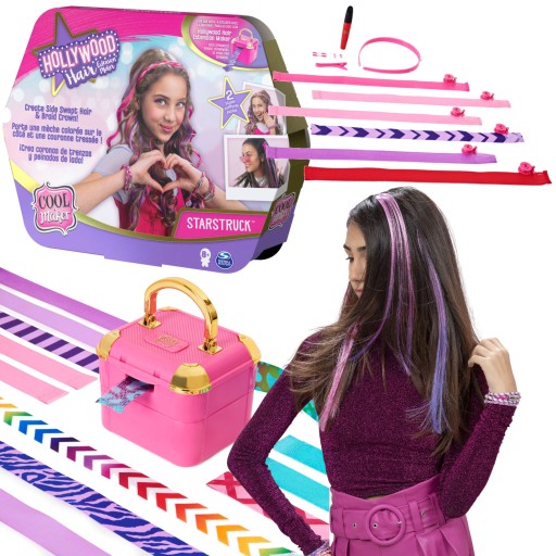 Hollywood Hair Extension Maker może zamienić wstążki załączone w zestawie w kolorowe pasemka. Można je później wystylizować za pomocą lokówki i akcesoriów w koki, fale lub loki i ozdobić przy pomocy spinek.