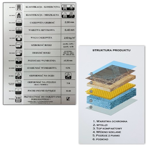 Elastyczna wykładzina przeznaczony do użytku przemysłowego i biurowego. Grubości wykładziny to 2,0 mm i warstwa użytkowa 0,40 mm jest odporna na wgniecenia, załamania, promienie UV. Może być wykorzystana do pokrycia podłogi w pomieszczeniu narażonym na działanie wilgoci lub wody. Struktura wykładziny o jednolitym kolorze, znajdzie swoje zastosowanie w pomieszczeniach cechujących się dużym natężeniem ruchu m.in. szkołach, biurach. Została wykonana z wytrzymałego materiału - polyvinylchloridu (PCV). Zaprezentowana wykładzina winylowa posiada najwyższe atesty trudnopalności (klasa Bfl-s1), dzięki czemu jest ona produktem spełniającym normy wymagane dla bezpiecznego użytkowania.