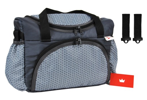 Pojemna, praktyczna, solidnie wykonana torba, niezastąpiona podczas spacerów i podróży. Wykonana z atestowanych, impregnowanych (wodoodpornych) tkanin stosowanych do produkcji wózków dziecięcych. Wewnątrz znajduje się czarna nieprzemakalna podszewka, cała torba usztywniona jest pianką PUR. Wewnątrz torby znajdują się niezbędne przegródki, które idealnie uporządkują wszystkie znajdujące się w niej akcesoria, dodatkowo po bokach znajdują się gumki dla podtrzymania butelek w pozycji pionowej. Na zewnątrz po bokach znajdują się kieszenie na butelki. Z przodu kieszeń zapinana na zamek na drobne akcesoria i dokumenty. Torba posiada krótkie uszy do noszenia w ręku oraz długi odpinany pasek. Torba posiada klipsy do montażu na wózku wyposażonym w haczyki oraz komplet dodatkowych uchwytów zapinanych na rzep do montażu na każdym innym wózku który nie jest wyposażony w haczyki do zawieszenia torby.