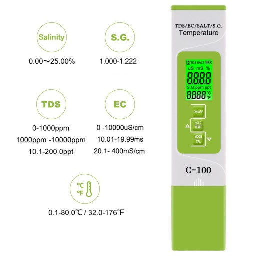 - Pomiar całkowitej ilości wszelkich rozpuszczonych w wodzie substancji (ppm), przewodności (µS), zasolenia (%), ciężaru właściwego (j.m.) oraz temperatury (°C)