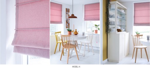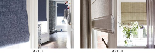 Roleta rzymska może być wykonana w trzech wariantach. Model III z wszytymi tunelami na szprosy z tyłu materiału. Model IX z wszytymi tunelami z przodu. Model II charakteryzuje się brakiem tuneli oraz wszytą taśmą transparentną z zewnętrznej strony rolety.