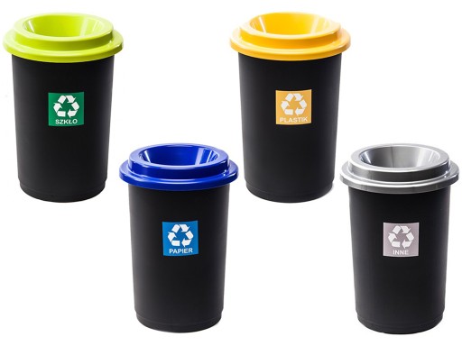 - Kolor: Brązowy - BIO, Niebieski - PAPIER, Zielony - SZKŁO, Żółty - PLASTIK;