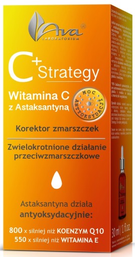 AVA C+ STRATEGY Korektor zmarszczek - serum do twarzy dzień/noc Serum na bazie witaminy C i astaksantyny, najsilniejszego naturalnego antyoksydantu. Witamina C zawarta w kładzie stymuluje produkcję kolagenu w skórze, natomiast ekstrakt z tamaryndowca indyjskiego działa rewitalizująco. Preparat delikatnie złuszcza martwy naskórek i przyspiesza odnowę komórkową. Skóra staje się jędrna, gładka i nawilżona.