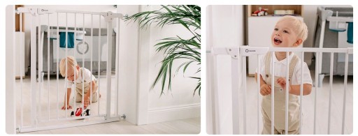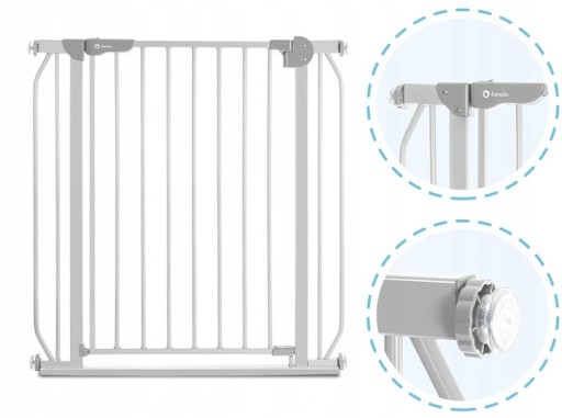 Szeroki zakres od 75 do 85 cm pasuje do większości standardowych framug. Specjalna nakładka umożliwia przedłużenie barierki aż do 105 cm. Po dołożeniu dodatkowego rozszerzenia bramkę można stosować również w celu zabezpieczenia schodów.