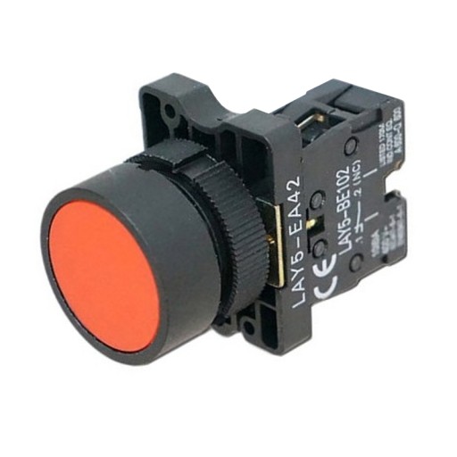 Przycisk kryty EA42 czerwony z samoczynnym powrotem. Wyposażony w styk NC. Możliwość robudowy o dodatkowe styki