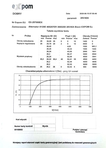 Alternatory EXPOM KWIDZYN eu; wykonane z najwyższej jakości komponentów dostarczanych tylko przez sprawdzonych i audytowanych poddostawców. 100% alternatorów przechodzi test wstępny oraz test końcowy; zwieńczony wydrukiem z numerem seryjnym. Numer ten wraz z testem pozostaje zachowany w archiwum Expom Kwidzyn Eu oraz jego indywidualna kopia dołączona jest do produktu. Alternatory EXPOM KWIDZYN eu posiadają wydłużoną do 36 miesięcy gwarancję.
