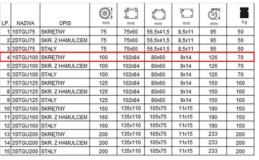 - OBUDOWY wykonane są blachy stalowej o dużej wytrzymałości. Płytka ma wymiary 102x84 mm. Kółka mają średnicę 100 mm, a centra mocowań mają wymiar 80 x 60 i owalne otwory do mocowania o wymiarach 14 x 9 mm. Wysokość całkowita wynosi 126 mm.