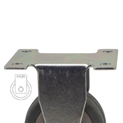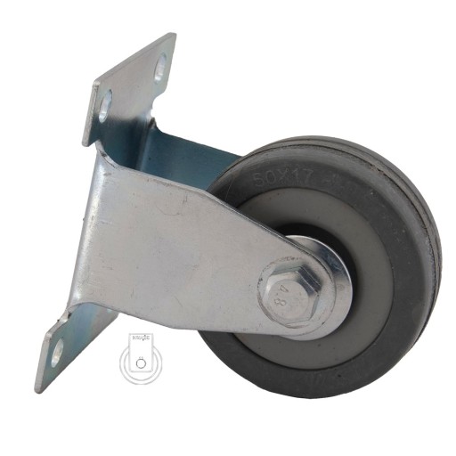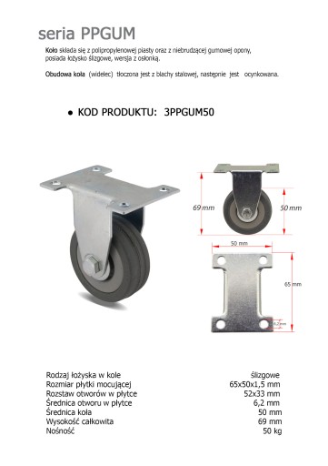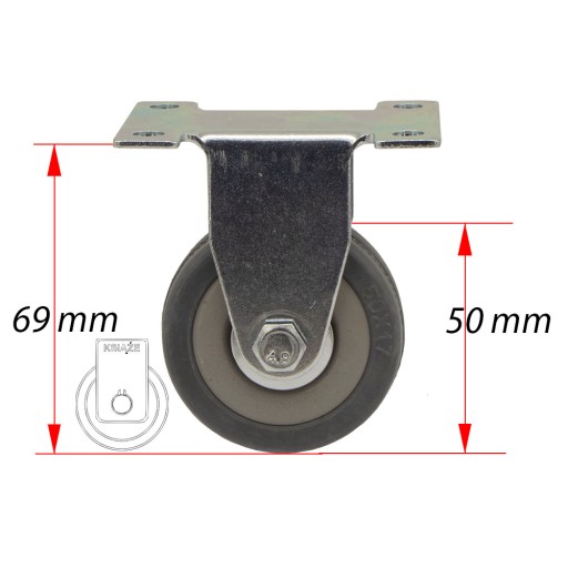 wykonane są blachy stalowej o dużej wytrzymałości, dodatkowo płyta ma wymiary 50x50 mm. Poza tym kółka mają średnicę 50 mm, a centra mocowań mają wymiar 36 x 36 i owalne otwory do mocowania o wymiarach 9 x 6,2 mm Na dodatek wysokość całkowita wynosi 69 mm.