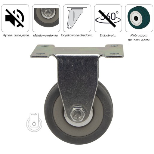 Koło składa się z polipropylenowej piasty oraz z niebrudzącej gumowej opony, posiada łożysko ślizgowe, wersja z osłonką.