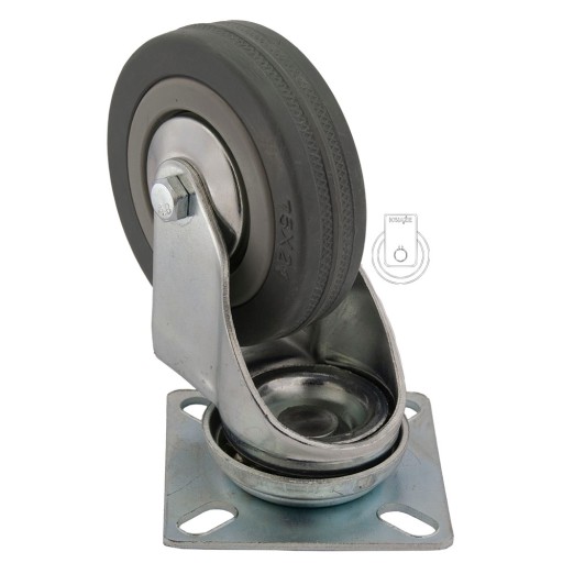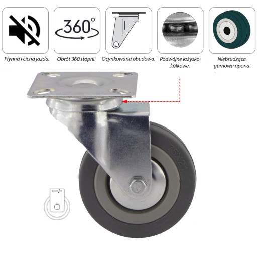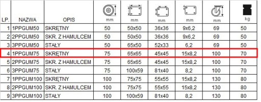 Koło składa się z polipropylenowej piasty oraz z niebrudzącej gumowej opony, posiada łożysko ślizgowe, wersja z osłonką. Mocowanie zestawu na płytkę o kodzie 1PPGUM75. W tabeli pod pozycją 4.