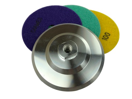 ZESTAW 3 SZT DYSKÓW POLERSKICH DIAMENTOWYCH NA SUCHO FI 125 OD #30; #50; #100 DO SZLIFOWANIA I POLEROWANIA KAMIENIA, GRANITU, BETONU, FAZOWANIA GRESU ORAZ CERAMIKI + UCHWYT ALUMINIOWY FI 125 M14