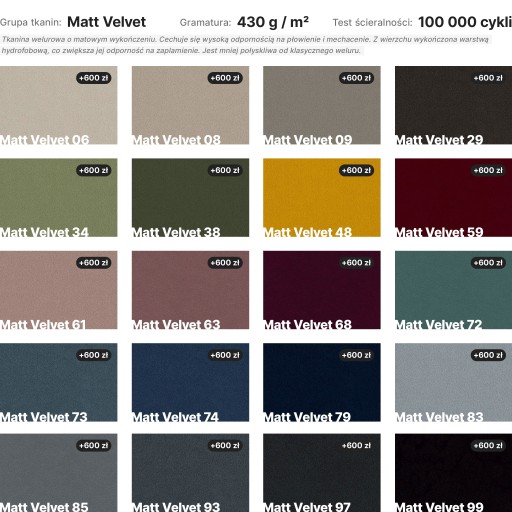 Dla tkaniny z grupy MATT VELVET przewidziana jest dopłata w wysokości 600 zł.