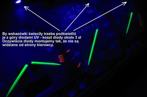 Nie kupuj farbek, pisaków itp gdy masz wskazówki, które są podświetlane z wnętrza licznika. W takich wskazówkach kolor i intensywność świecenia możesz zmienić montując diodę w dowolnym kolorze tuż przy osi wskazówki wewnątrz licznika. Stosowanie farb i pisaków w takich wskazówkach nie daje efektu takiego jak wstawienie diody.