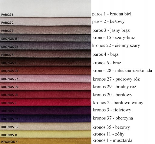 Jest mocną, bardzo zwartą, plecioną tkaniną, dostępną w szerokiej gamie kolorystycznej z efektem delikatnego mienienia i cieniowania z włosem, co jest charakterystyczne dla tkanin welurowych. Wszystkie te cechy sprawiają, że meble wykonane w tkaninie KRONOS mają bardzo elegancki wygląd.