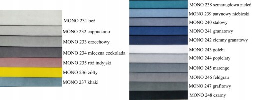 Mono to specjalnie wyselekcjonowana kolekcja spełniająca potrzeby nawet najbardziej wymagających klientów. Jest materiałem miękkim i przyjemnym w dotyku. Nowoczesna paleta kolorystyczna pozwala dopasować materiał według najnowszych trendów.