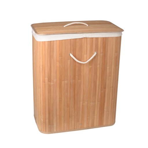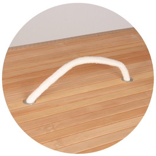 Pojemny kosz na pranie wykonany z naturalnego drewna bambusowego oraz tkaniny. Na sztywnych ściankach zawieszony jest duży worek wyposażony w dwie odrębne komory. Kosz jest bardzo prosty w utrzymaniu czystości. Worek materiałowy można z łatwością wyjąć i odświeżyć w pralce w temperaturze do 30°C. Dodatkowym atutem kosza jest jego stabilność którą zapewnia solidnie i starannie wykonany stelaż. Uchwyty boczne zapewniają komfort podczas przenoszenia w dowolne miejsce, a pokrywa chroni przed rozprzestrzenianiem się nieprzyjemnych zapachów.