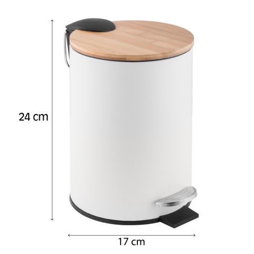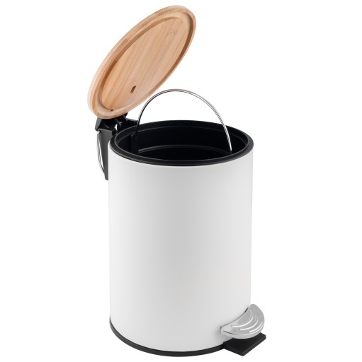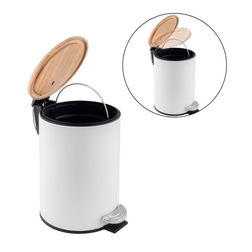 Kosz łazienkowy wykonany ze stali malowanej proszkowo na biało. Pokrywa zrobiona z drewna bambusowego. Pojemnik o idealnie gładkim, matowym wykończeniu.