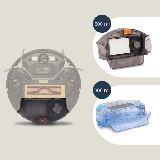 Robot jest wyposażony w innowacyjny system mopowania z trzema stopniami nawilżenia, zapewniając niezrównaną czystość podłóg z minimalnym wysiłkiem. Dzięki dużemu zbiornikowi na wodę o pojemności 360 ml, urządzenie gwarantuje długotrwałą i wyjątkowo skuteczną pracę.