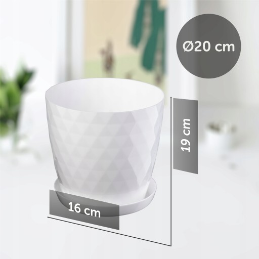 Nadaje się do zastosowania do wewnątrz. Produkt ma owalny kształt o średnicy 20cm, i wysokości 19cm. Na komplet składa się doniczka z podstawką w tym samym kolorze. Średnica podstawki to 17cm