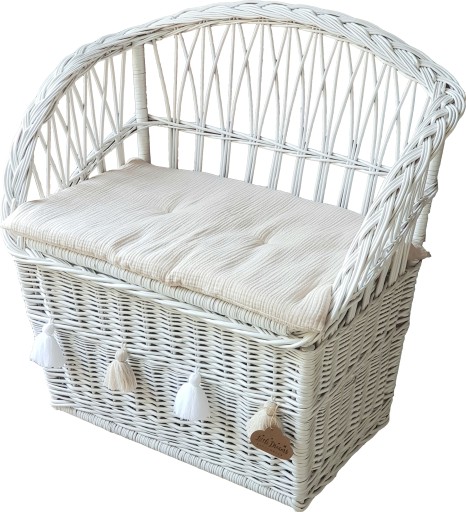 Przepiękny mebel do dekoracji pokoju dziecięcego i nie tylko. Będzie pełnił funkcję siedziska i miejsca do przechowywania zabawek. Do siedziska przymocowana jest mięciutka poduszka uszyta z delikatnego i przyjemnego w dotyku muślinu w kolorze naturalnym, wypełniona antyalergiczną włókniną. Chwosty można odwiązać i przymocować w innym miejscu.