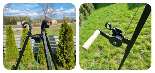 - Kołowrotek: po stronie zewnętrznej z drewnianą rączką i zapadką
