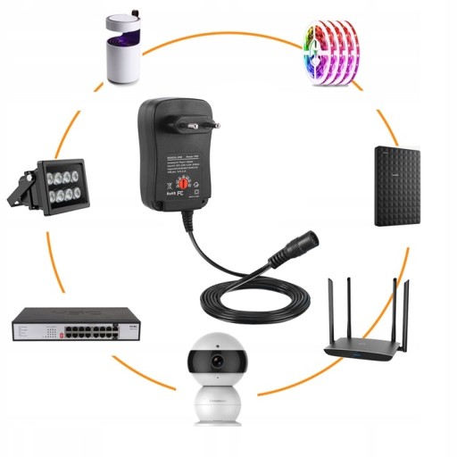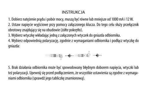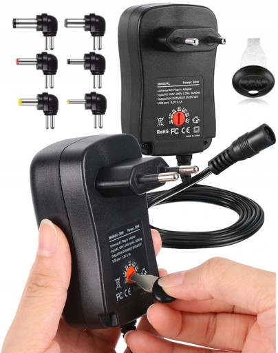 Zasilacz sieciowy uniwersalny do większości urządzeń dostępnych na polskim rynku. Regulacja mocy wyjściowej oraz 6 wymiennych wtyków pozwalają na dopasowanie ładowarki do danego urządzenia. W zestawie jest klucz ułatwiający zmianę napięcia.