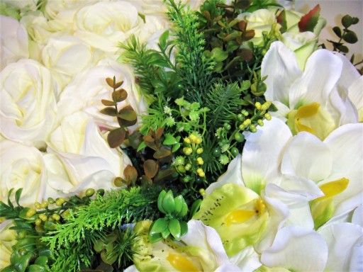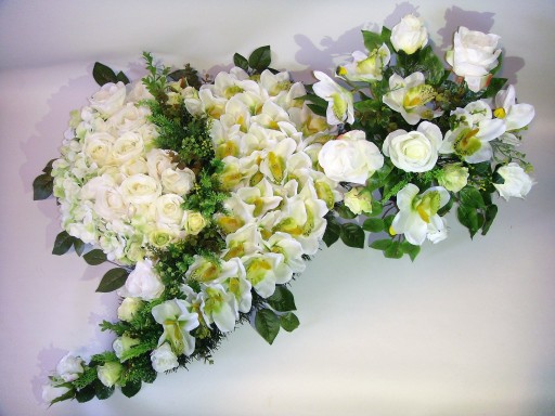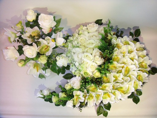 Do wykonania oferowanej kompozycji użyto wysokiej jakości kwiatów sztucznych róż, storczyka, hortensji, zielonych gałązek, gipsówki innych dodatków florystycznych. Użyte materiały są bardzo dobrej jakości, odporne na warunki atmosferyczne. Serce wykonane jest na styropianie przyklejonym do wodoodpornej sklejki. Od spodu jest zamocowana podpórka aby serce nie leżało płasko. Może ona służyć również za "rączkę" do trzymania serca jeżeli ma być np. na pogrzeb.