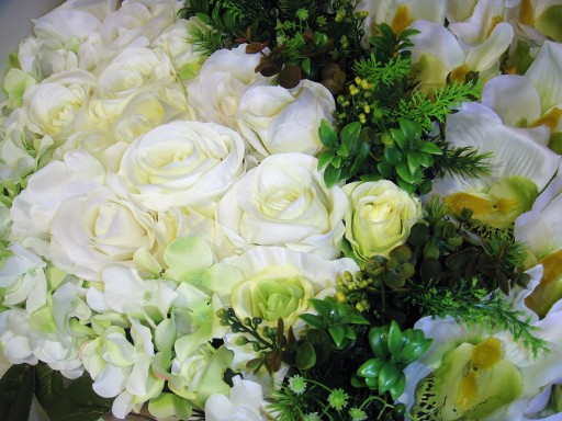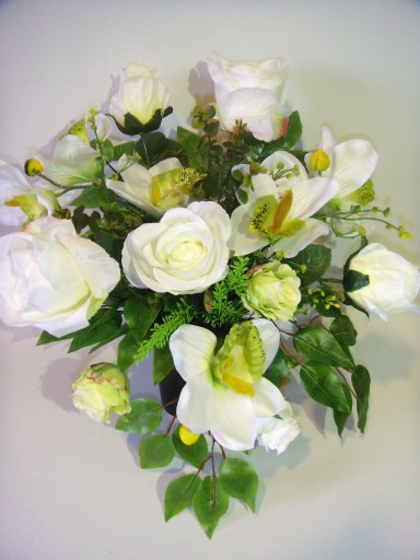 W kompozycji użyto różnej wielkości róż , storczyka, hortensji, oraz licznych dodatków florystycznych. Kwiaty są ładnie i starannie ułożone (wklejane klejem na gorąco), kompozycja z każdej strony prezentuje się bardzo ładnie (nie ma tzw. tyłu)