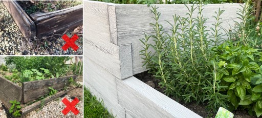 - warzywnik wykonany z betonu jest bardzo trwały i posłuży wiele lat, w przeciwieństwie do rabat drewnianych, które z czasem ulegają rozkładowi.
