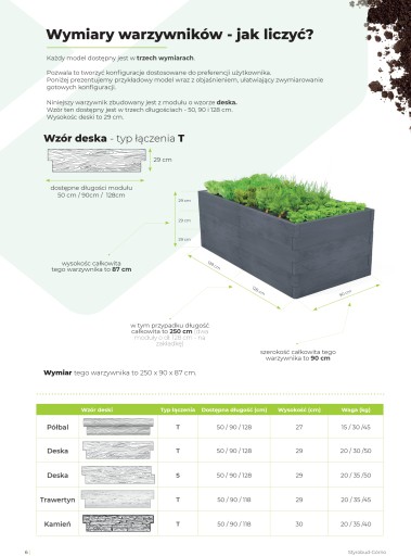 Dzięki modułowej budowie każdy warzywnik możemy w dowolne strony rozbudowywać, tworzyć własne kształty, wysokości oraz stopniowania (piętrowana rabata). Jeden moduł ma wysokość 29cm i dostępny jest w trzech długościach 50cm, 90cm i 128cm. Dzięki różnym długościom, z elementów można zbudować donice, kwietniki wokół tarasu lub wykorzystać warzywnik jako kompostownik.