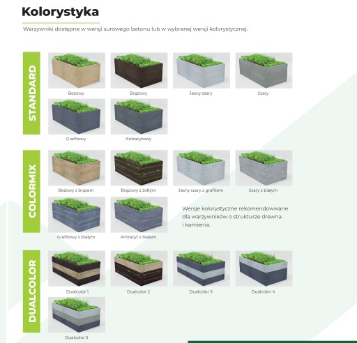 Dzięki temu, że warzywnik wykonany jest z betonu jest bardzo trwały i posłuży wiele lat, w przeciwieństwie do rabat drewnianych, które z czasem ulegają rozkładowi. Oferowane przez nas skrzynie na warzywa wykonane są z betonu imitującego drewno lub trawertyn (beton architektoniczny), dzięki temu są niezwykle estetyczne.