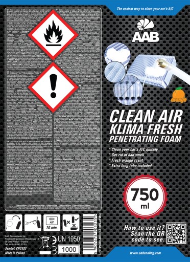 AAB CLEAN AIR KLIMA FRESH PENETRATING FOAM 750 ml (aktywna piana) to najnowszy środek od AAB do skutecznego czyszczenia systemów klimatyzacji i wentylacji samochodowych oraz klimatyzatorów domowych w sprayu. Udoskonalona formuła aktywnych składników skutecznie wyczyści i zlikwiduje nieprzyjemny zapach, zapewni Tobie i Twoim bliskim niesamowitą świeżość i czystość powietrza z nutą delikatnego pomarańczowego zapachu. Produkt nie pozostawia tłustych plam i bardzo łatwo się czyści.Nie odkładaj czyszczenia klimatyzacji na później! Zacznij dbać o zdrowie Swoje i Swoich bliskich!