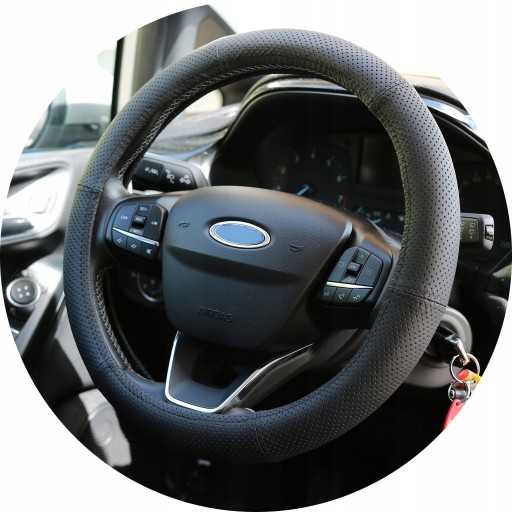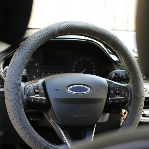 Pokrowiec na kierownicę został wykonany ze specjalnego gumowego pierścienia oraz wysokogatunkowej perforowanej skóry naturalnej.