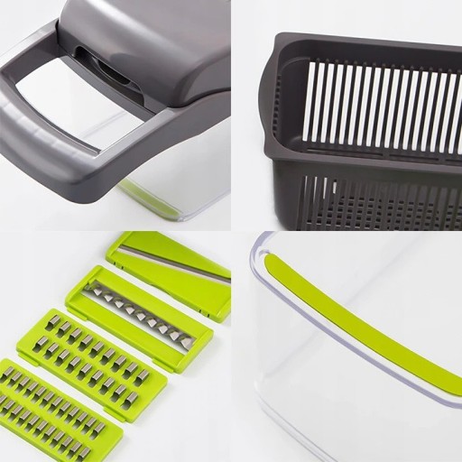 Ostrze ze stali nierdzewnej kroi warzywa i owoce, które wpadają bezpośrednio do przezroczystego pojemnika. Otwór w pojemniku szatkownicy pozwala łatwo wysypywać posiekane produkty, bez konieczności otwierania urządzenia. Wyjmowana, silikonowa kratka ułatwia czyszczenie urządzenia.