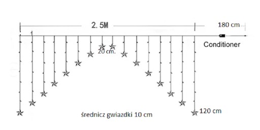 Długość świetlna od pierwszej gwiazdy do ostatniej gwiazdy wynosi 2,5 m. + kabel zasilający 180cm. + dodatkowa wtyczka