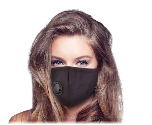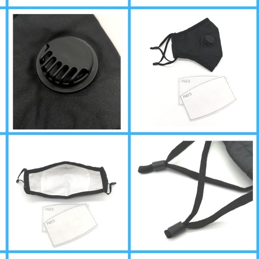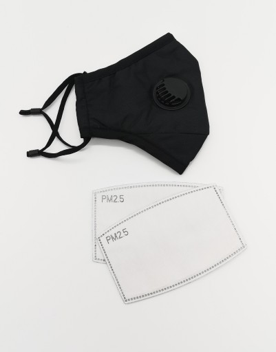 - Maseczka ochronna bawełniana z zaworem oraz komorą na filtr w kolorze czarnym.