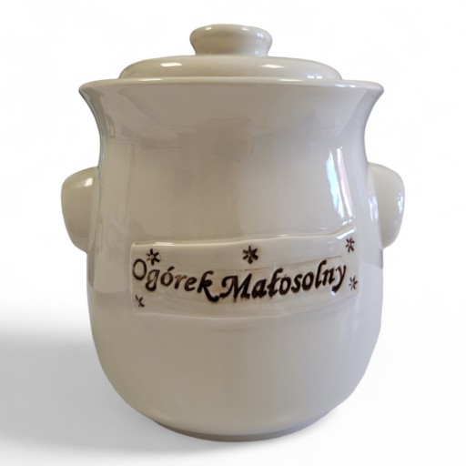 Oryginalna, ręcznie tworzona ceramiczna beczka z napisem Ogórek Małosolny wykonana z wysokiej jakości ceramiki wytwarzanej z naturalnych glin kamionkowych. Dzięki zastosowaniu do produkcji wysokiej jakości surowców jest całkowicie bezpieczna w kontakcie z żywnością. Beczka została pokryta solidną warstwą szkliwa która zapewnia jej wyjątkową trwałość i odporność na ścieranie. Przeznaczona jest do długotrwałego przechowywania żywności w warunkach ekologicznych, bez użycia konserwantów. Doskonale nadaje się do kiszenia ogórków, kwaszenia kapusty, peklowania mięsa, przechowywania smalcu. Wkładając pokrywkę w wypełniony wodą kołnierz beczki odcina się dopływ powietrza do wnętrza naczynia. Umieszczone w nim warzywa fermentują, wytwarzając dwutlenek węgla który z czasem wypiera całkowicie powietrze. W ten sposób w beczce tworzy się atmosfera beztlenowa. Dojrzewające w niej przetwory nabierają niepowtarzalnego smaku. Charakteryzuje je wysoka jakość, funkcjonalność i estetyczne wykonanie.
